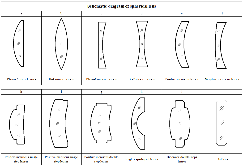 Plano-convex lenses, double-convex lenses, plano-concave lenses, double-concave lenses, positive meniscus lenses, negative meniscus lenses, flat lenses, single-cap lenses, double-convex double-step lenses