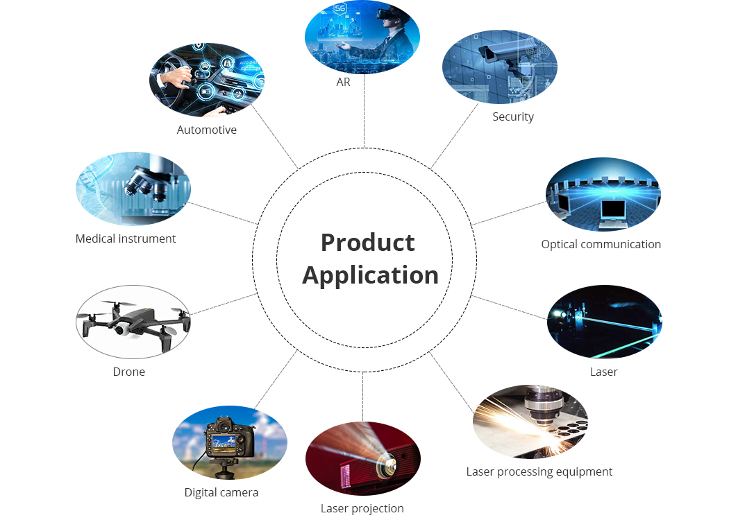 Glass lenses have a wide distribution of refractive index and dispersion, and have good adaptability to temperature and environment. They are widely used in high-end optical lenses, such as digital cameras, security, automotive, optical communications, laser projection, medical, unmanned machine, AR, etc.